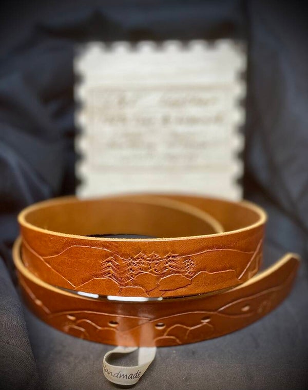 Deze riem heeft een mooi western tafereel en is volledig met de hand bewerkt en afgewerkt.
