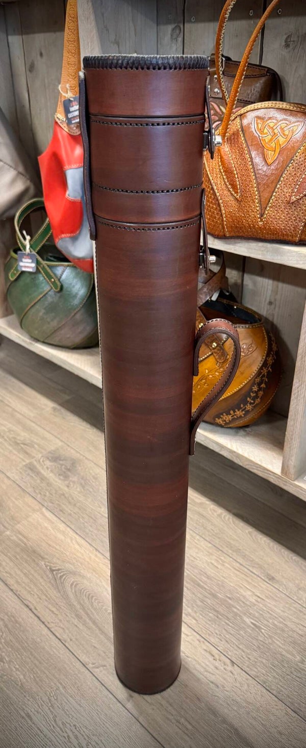 Biljartkoker dia. 110 bruin donkerbruin, biljarter op het deksel, marlboro rood binnenwerk.