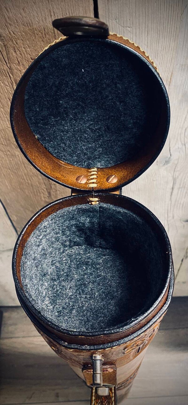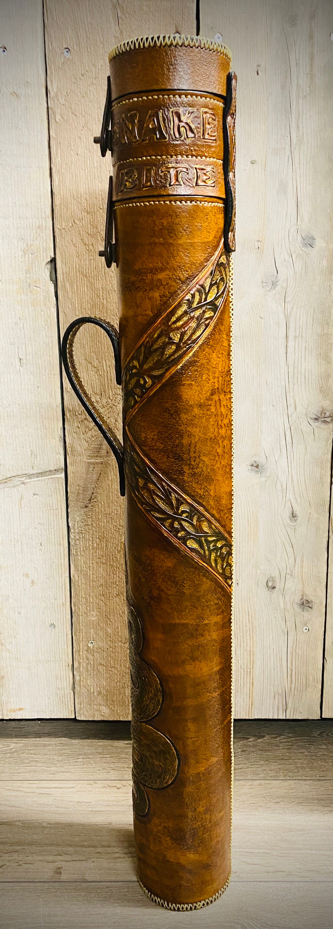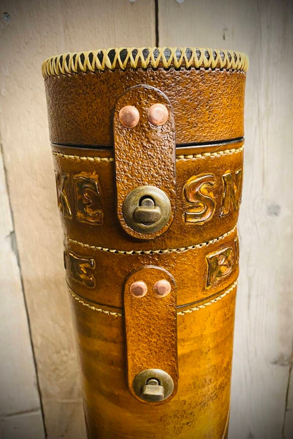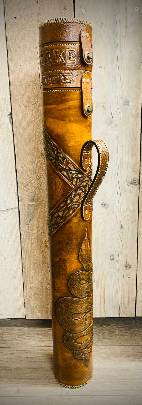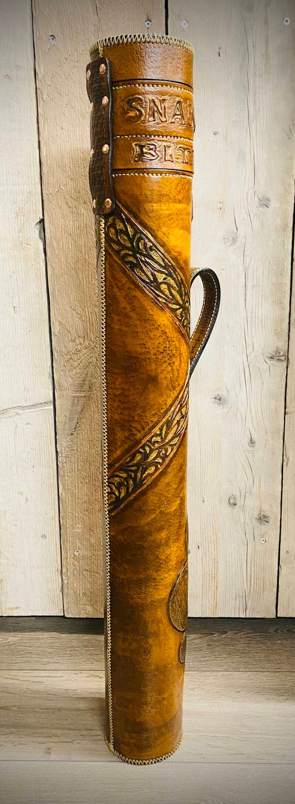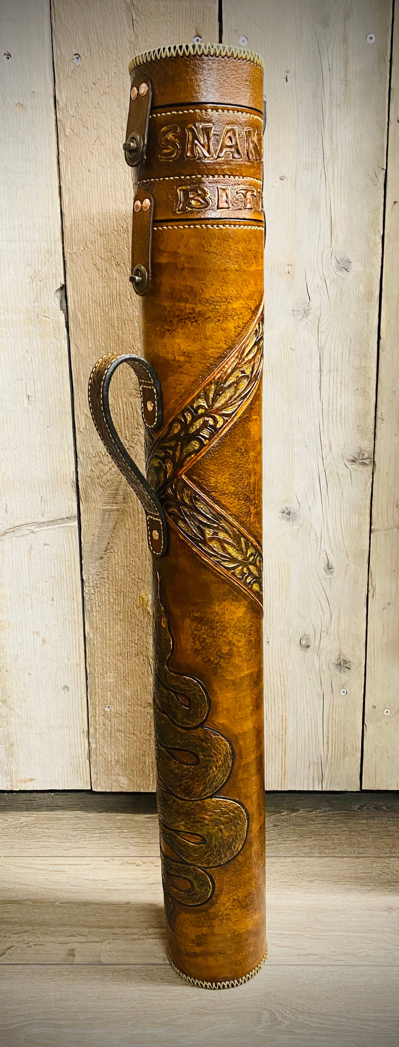 Deze prachtige biljartkoker in antiek bruin, diameter 110mm, antraciet 3mm vilten binnenwerk, SNAKEBITE op 2 zijden van de koker op het krijtvak, 2 originele artwork kruisbanden, snakehead op het deksel en volledig uitgewerkte venom snake op de body. Alle details in het handvat en het scharnier ingewerkt.