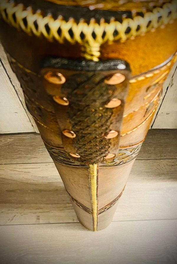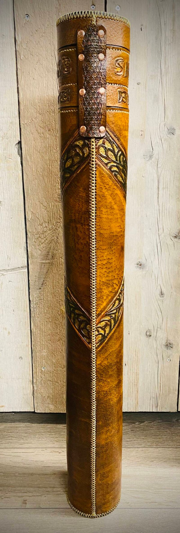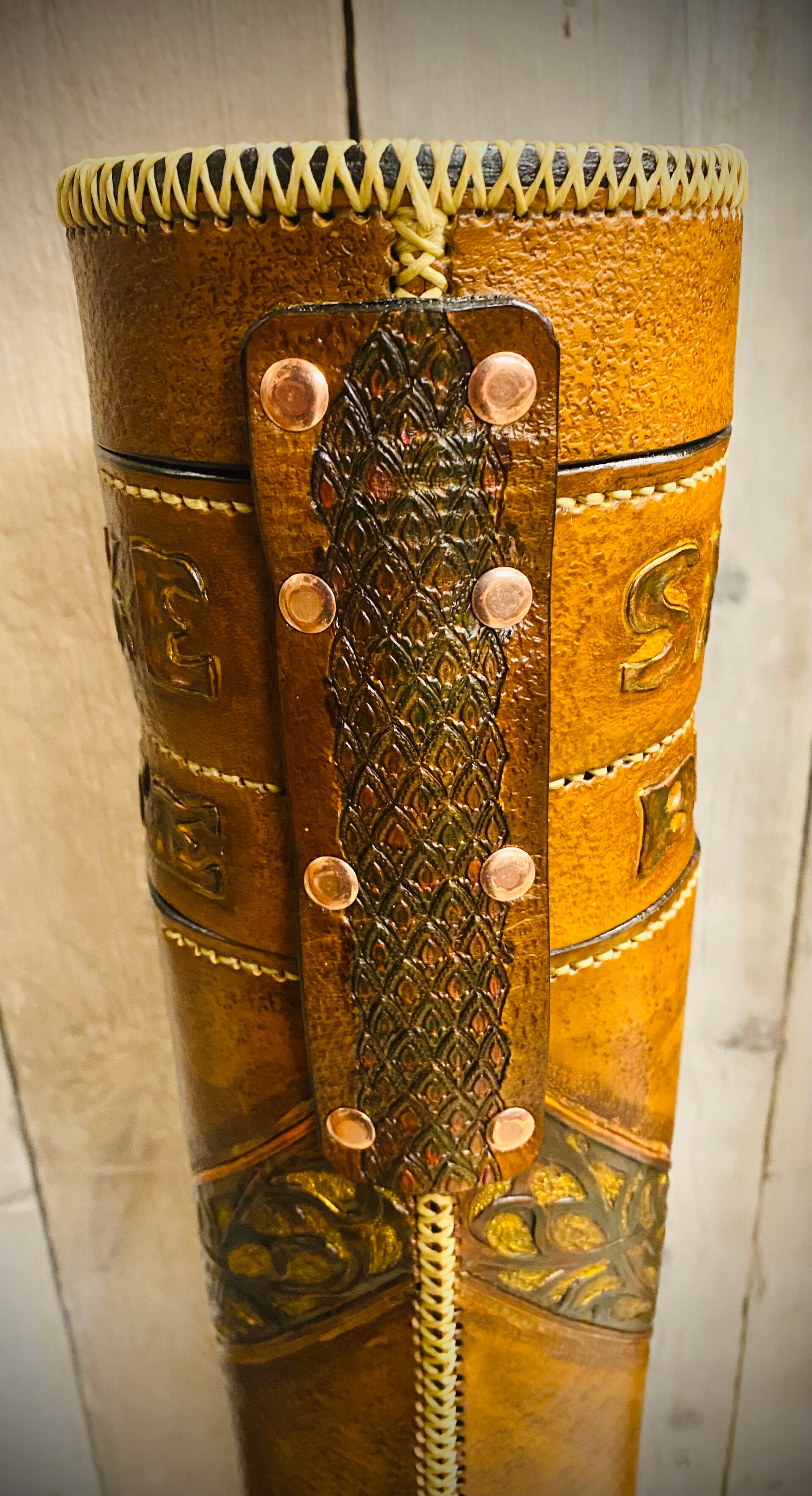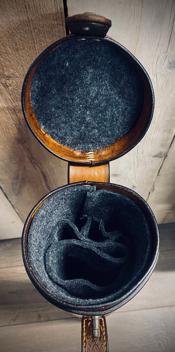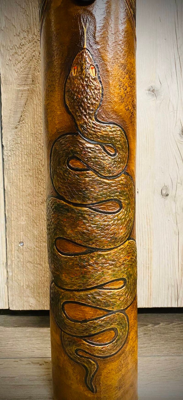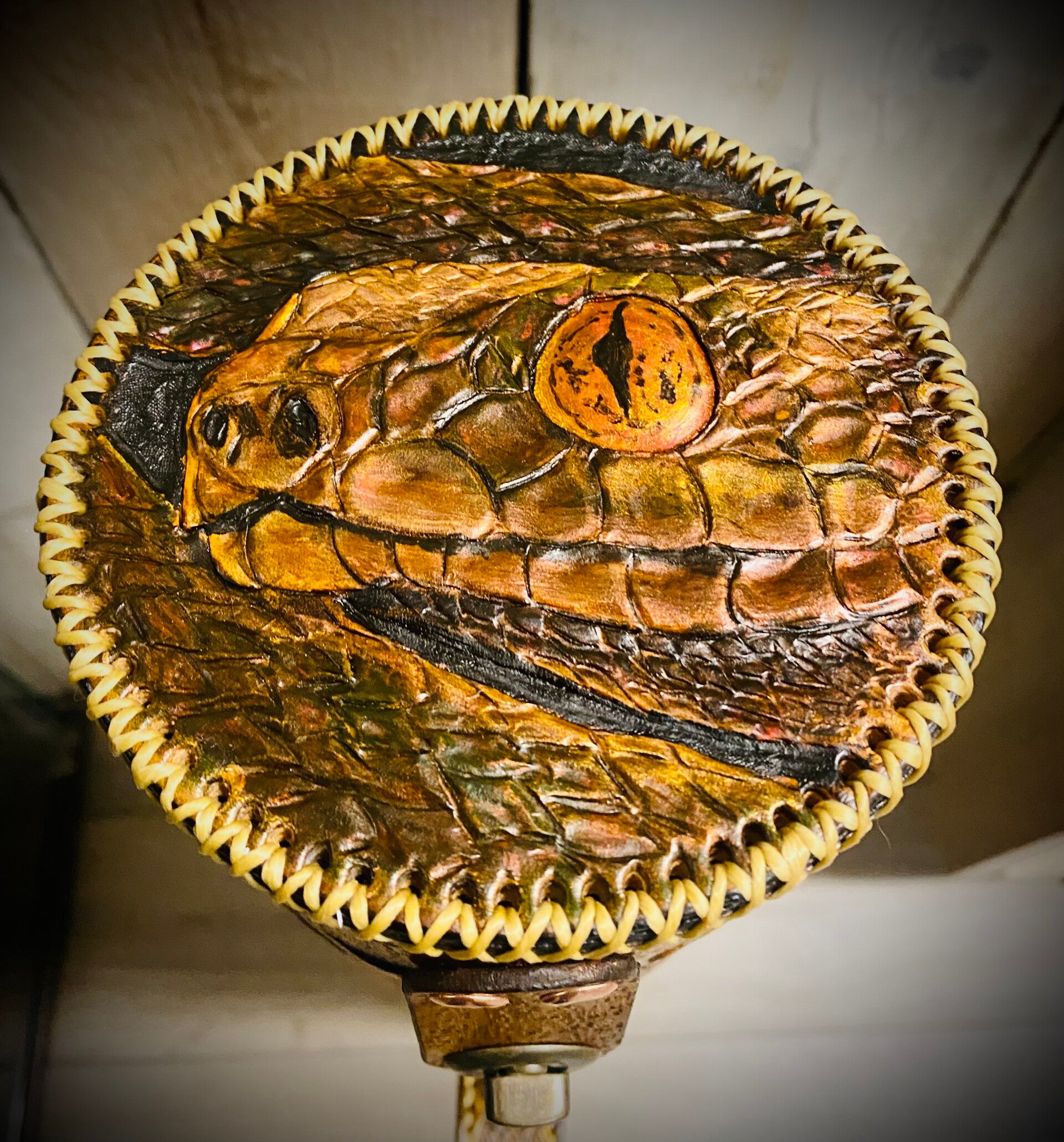 Deze prachtige biljartkoker in antiek bruin, diameter 110mm, antraciet 3mm vilten binnenwerk, SNAKEBITE op 2 zijden van de koker op het krijtvak, 2 originele artwork kruisbanden, snakehead op het deksel en volledig uitgewerkte venom snake op de body. Alle details in het handvat en het scharnier ingewerkt.