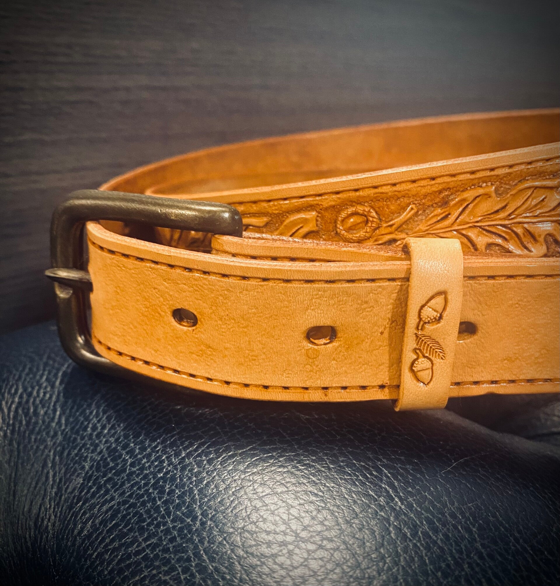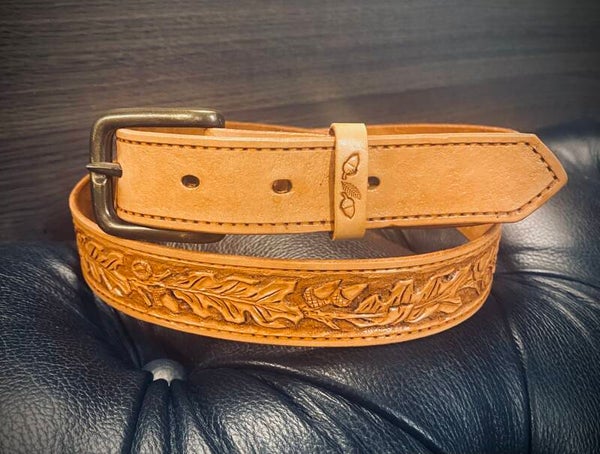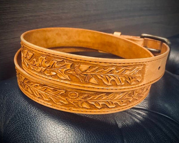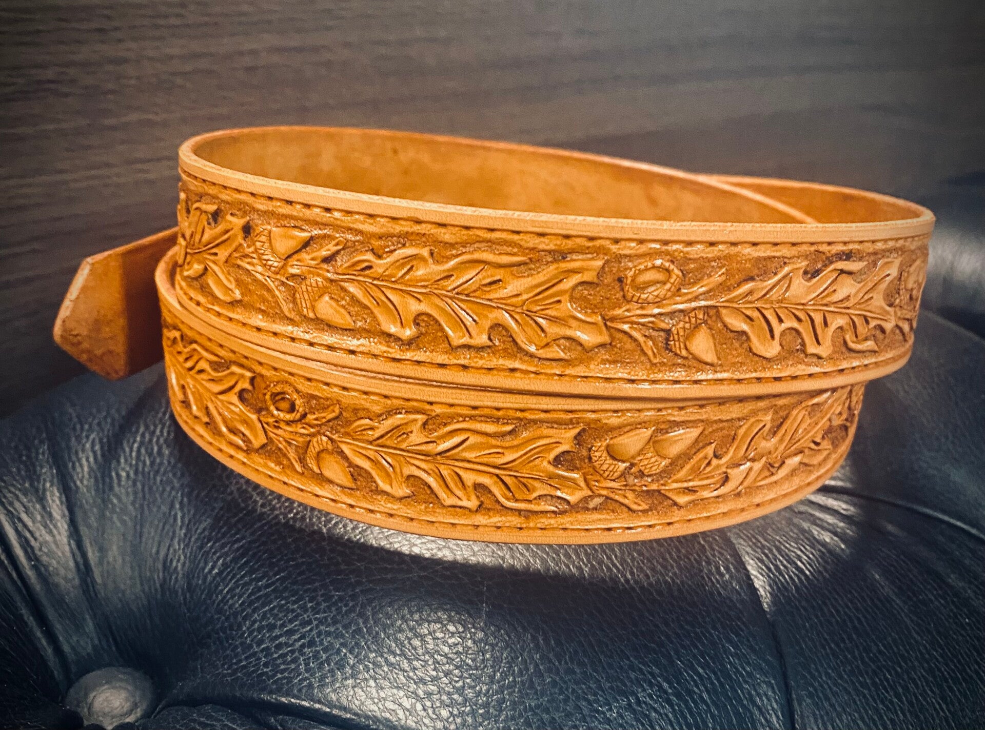 Prachtige broekriem voor hem of haar met eikenbladeren motief in naturel kleur en met antiek accenten afgewerkt draagmaat 105cm